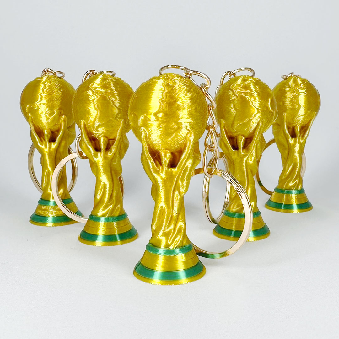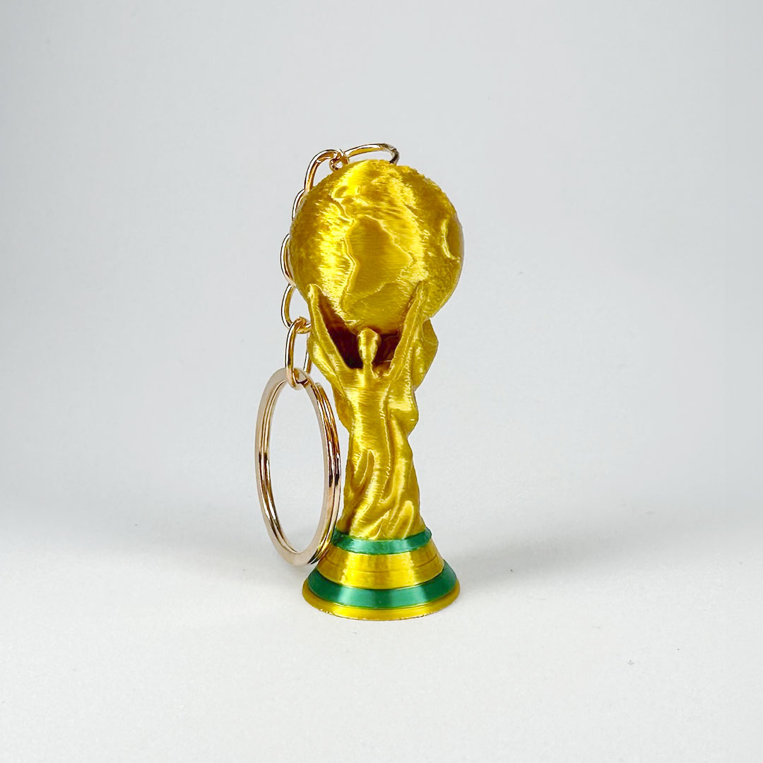 Inspirado no troféu mais famoso do futebol, este chaveiro é perfeito para torcedores, colecionadores e fãs da Copa do Mundo.